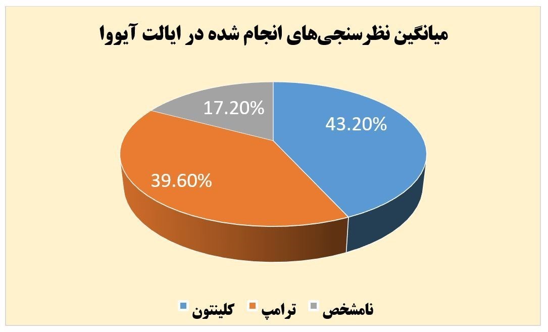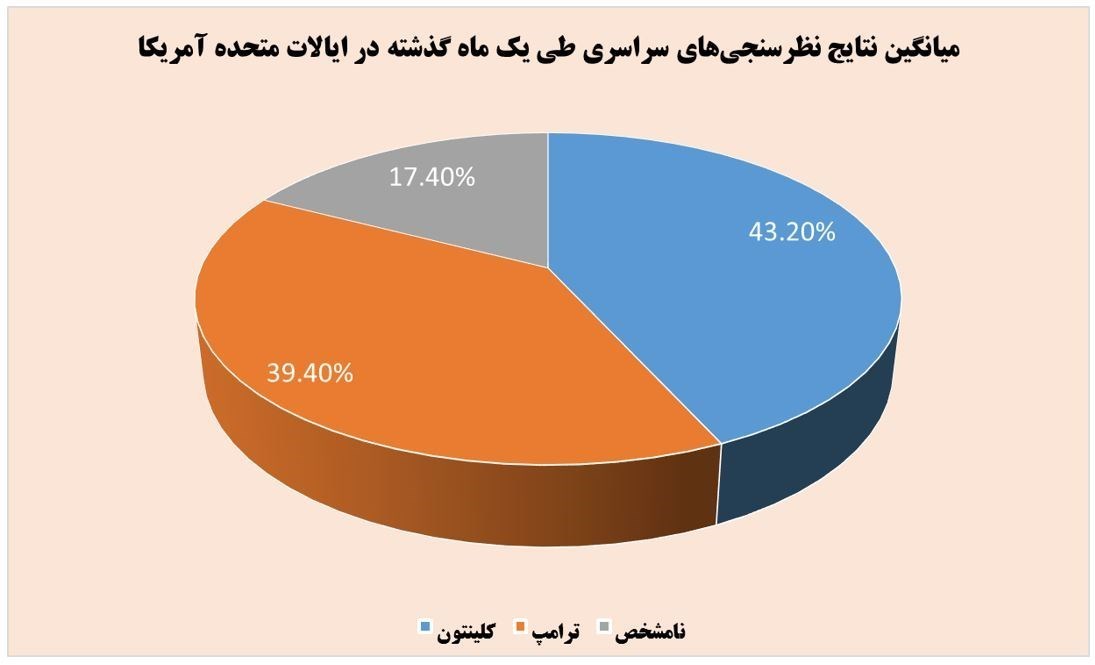 طی یک ماهه اخیر نیز، میانگین نظرسنجیهای سراسری در ایالات متحده آمریکا بیانگر پیشتاز بودن بیش از 3 درصد هیلاری کلینتون نسبت به دونالد ترامپ هستند.