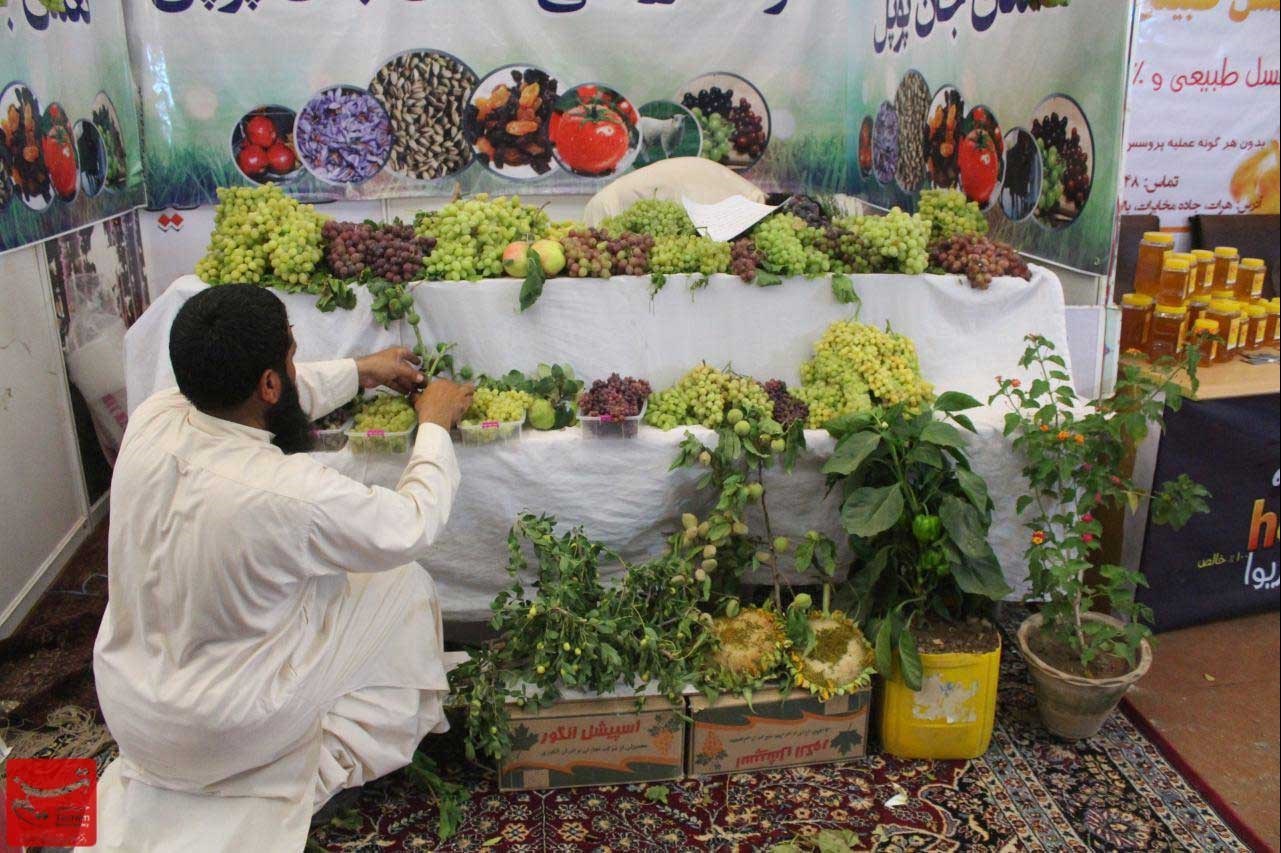انگور، انواع سبزیجات، عسل، لبنیات، حبوبات، داروهای گیاهی و ماشین آلات صنعتی کشاورزی و دامداری همچنین زعفران از موارد عرضه شده در این نمایشگاه هستند.