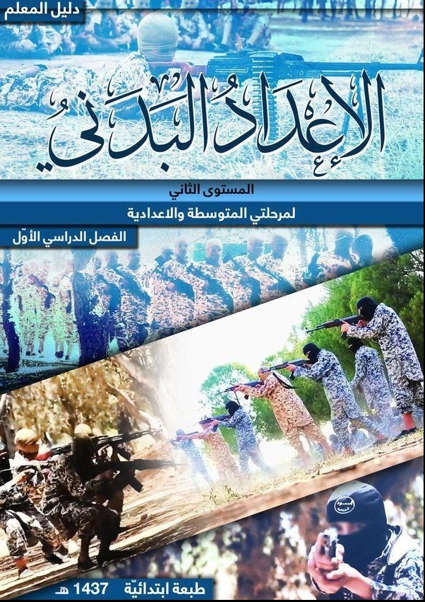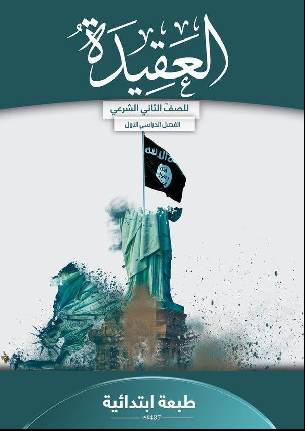 جلد کتابهای گروه تروریستی داعش حاوی تصاویری از مجسمه سربریده آزادی و نیز جنگجویی با کلاشنیکف است.