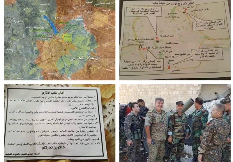 از سوی دیگر نیروهای ارتش سوریه چهار گذرگاه اصلی را برای خروج اهالی مناطق شرقی حلب فراهم کرده اند به این ترتیب که اطلاعیه هایی را بر فراز این مناطق پخش کرده اند که در آن ضمن اعلام باز بودن این گذرگاهها به روی آنان توضیح داده شد ه است که چگونه به سمت محل استقرار نیروهای ارتش حرکت کنند تا در امان باشند.