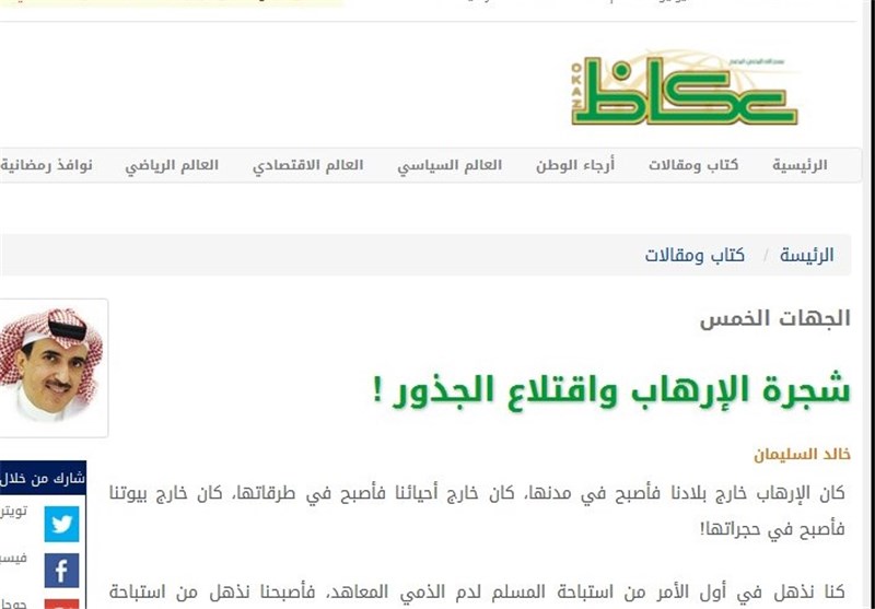روزنامه عکاظ بر ضرورت قطع ریشههای تروریسم و پوستاندازی جامعه عربستان و نیاز آن به یک انتفاضه اجتماعی فراگیر برای قطع ارتباط آن با هر چیزی که به فرهنگ مرگ و نفرتپراکنی مرتبط است، تاکید کرد و هشدار داد در غیر این صورت، مردم ما(عربستان) شرایط فردی را دارند که در حال احتضار و مرگ است.