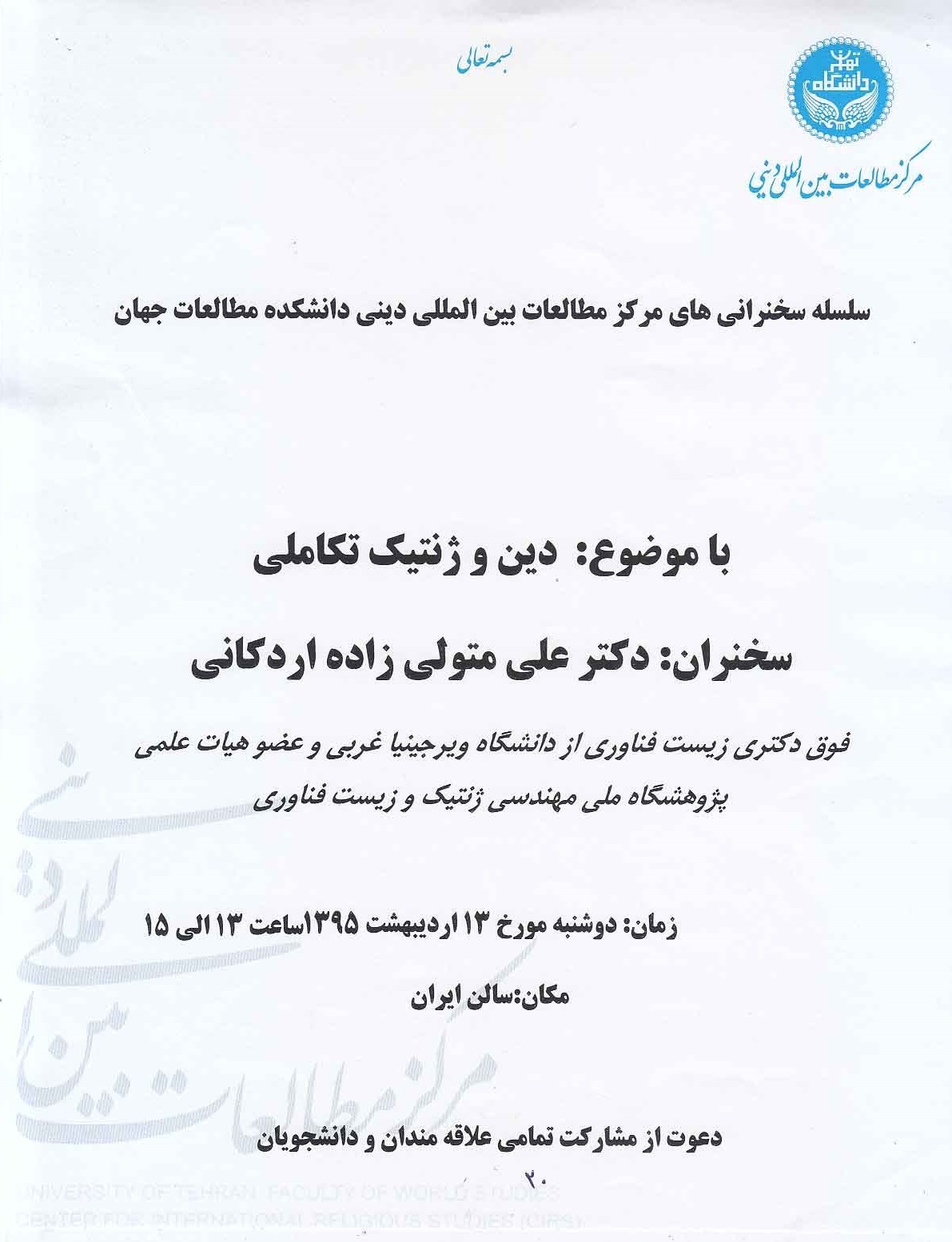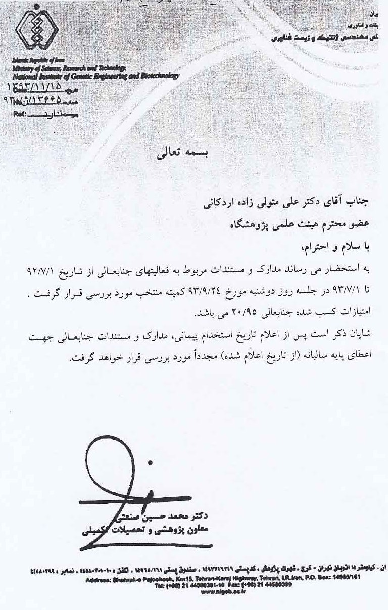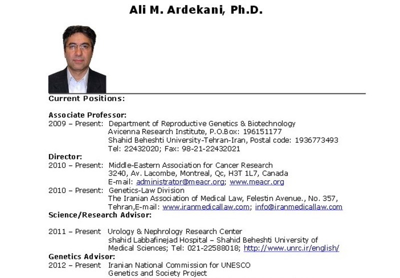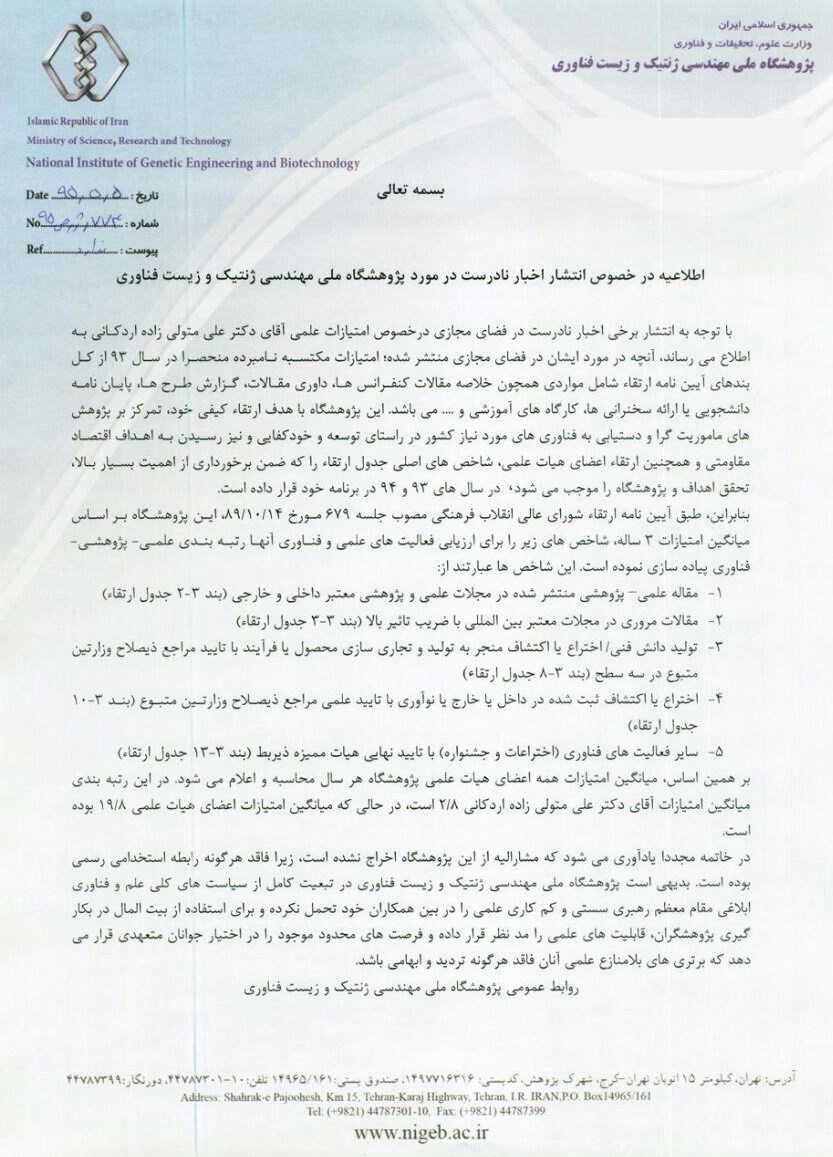 اطلاعیه پژوهشگاه ملی ژنتیک در مورد برکناری دکتر اردکانی
