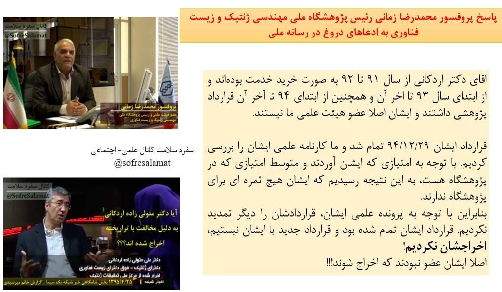 در پی انتشار این خبر، مسئول «پژوهشگاه» ملی ژنتیک ضمن انتشار اطلاعیهای، در یک فیلم کوتاه نسبت به این موضوع واکنش عجیب و نامتعارفی نشان داد و متولی زاده اردکانی را فاقد صلاحیت علمی برای ادامه همکاری دانست. این فیلم کوتاه را ببینید.