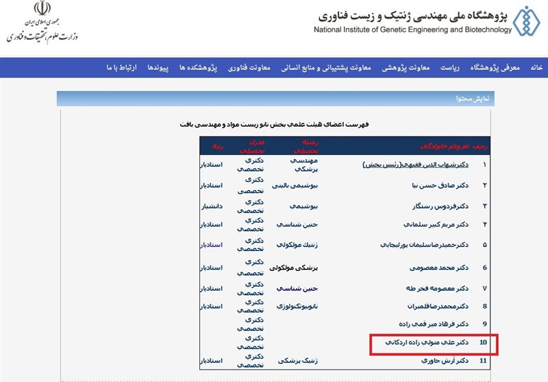 اما سایت «پژوهشگاه» در همان تاریخ 7 مرداد 95 دکتر متولیزاده اردکانی را بهعنوان عضو هیئت علمی در گروه پزشکی مولکولی معرفی و درج کرده است {اینجا}
