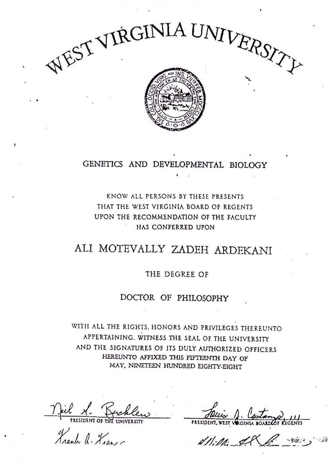 مدرک متولی زاده اردکانی از دانشگاه ویرجینیای غربی