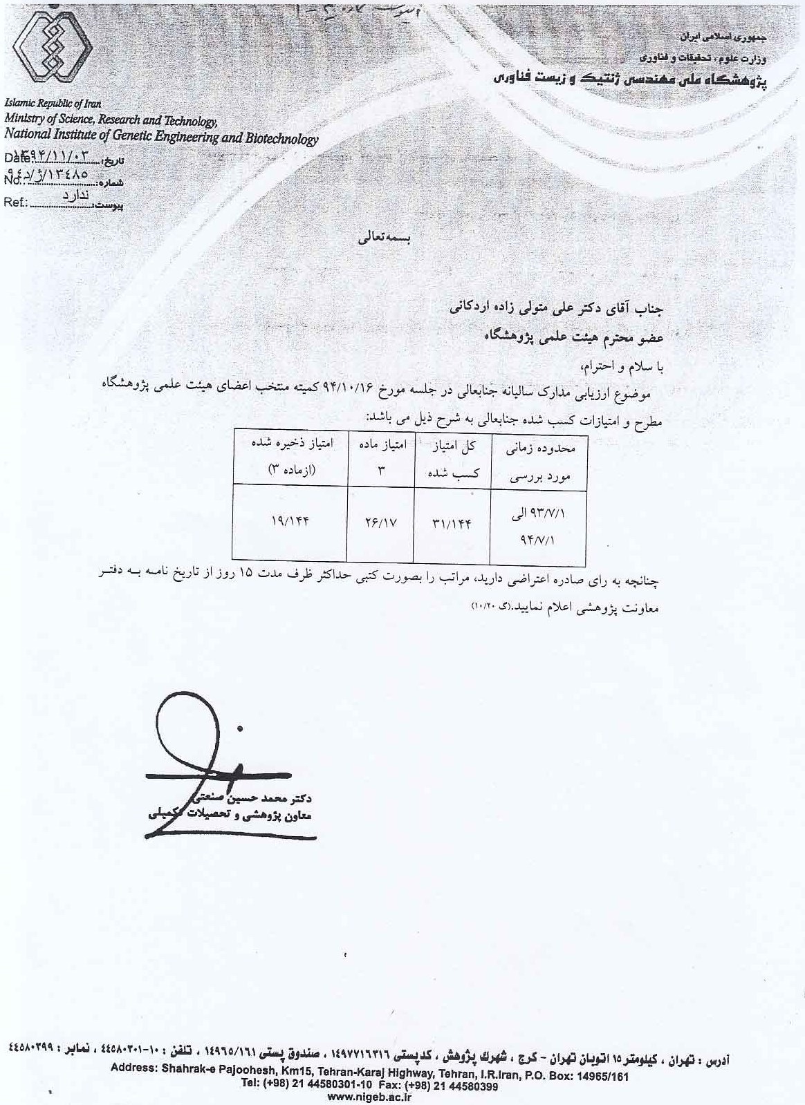 مدرکی دال بر اینکه دکتر متولیزاده اردکانی عضو هیئت علمی «پژوهشگاه» بوده و همچنین امتیازش برخلاف اظهارنظر رئیس «پژوهشگاه» 2.8 نیست.
