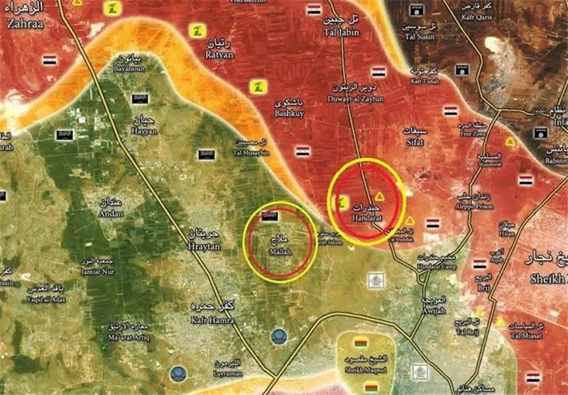 به گزارش خبرنگار خبرگزاری تسنیم از دمشق، ارتش سوریه و نیروهای مقاومت «کارگاه الحدید»، «مقطع الشاهر» و «پروژه اردوگاه» بههمراه بخشهای زیادی از اردوگاه آوارگان فلسطینی (حندرات) را در شمال حلب آزاد کردند.