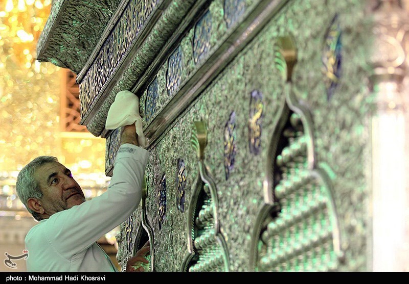 همزمان با مدیحهسرایی ذاکران اهل بیت(ع) نیز آئین غبارروبی ادامه یافت و سنگ مضجع منور رضوی نیز با گلاب ناب شستوشو داده شد.