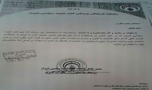 در نامه‌ای که مدیرعامل باشگاه فجر شهید سپاسی به استاندار فارس ارسال کرده وجود مشکلات شدید مالی و عدم حمایت مسئولان از این تیم، عامل اصلی انصراف آنها از حضور در لیگ دسته اول عنوان شده و گفته است که  موضوع انصراف این تیم به سازمان لیگ فوتبال نیز اطلاع داده شده است.