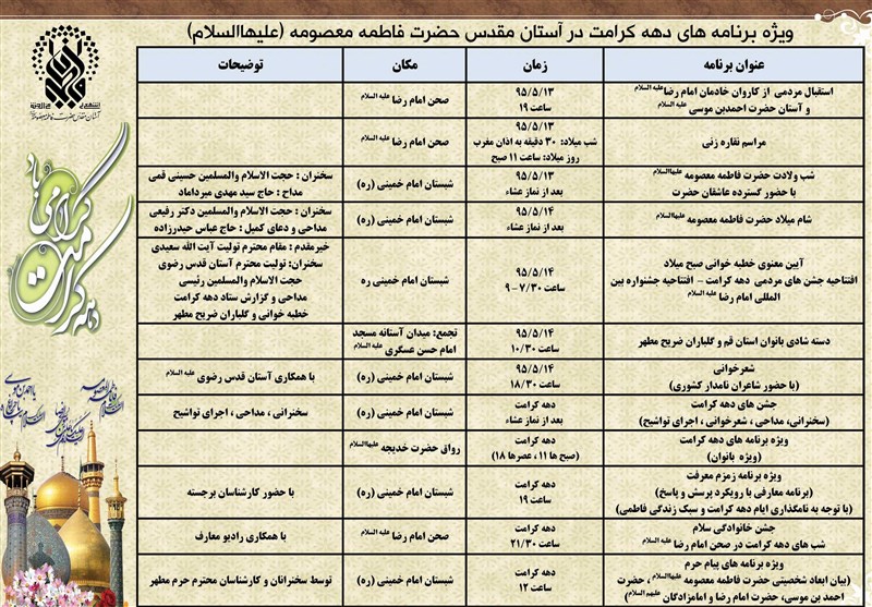 به گزارش خبرنگار فرهنگی باشگاه خبرنگاران تسنیم«پویا» در ایام ولادت با سعادت حضرت فاطمه معصومه(س) آستان مقدس آن حضرت ویژه‎برنامه دهه کرامت را به شرح جدول ذیل اعلام کرد: