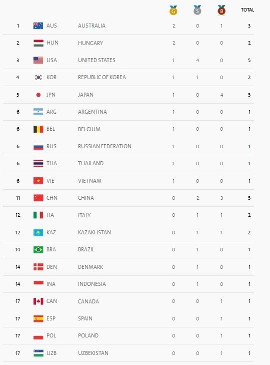 استرالیا و مجارستان 2 طلا و آمریکا، کره جنوبی، ژاپن، آرژانتین، بلژیک، روسیه تایلند و ویتنام نیز هر کدام یک طلا به دست آوردهاند.