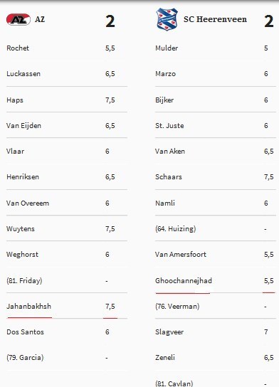 فوتبال اینترنشنال هلند در ارزیابی کیفی بازی بازیکنان دو تیم آلکمار و هیرنوین نیز به علیرضا جهانبخش نمره خیلی خوب هفت و نیم را اختصاص داد. رضا قوچاننژاد، مهاجم تیم هیرنوین هم نمره متوسط پنج و نیم را دریافت کرد.
