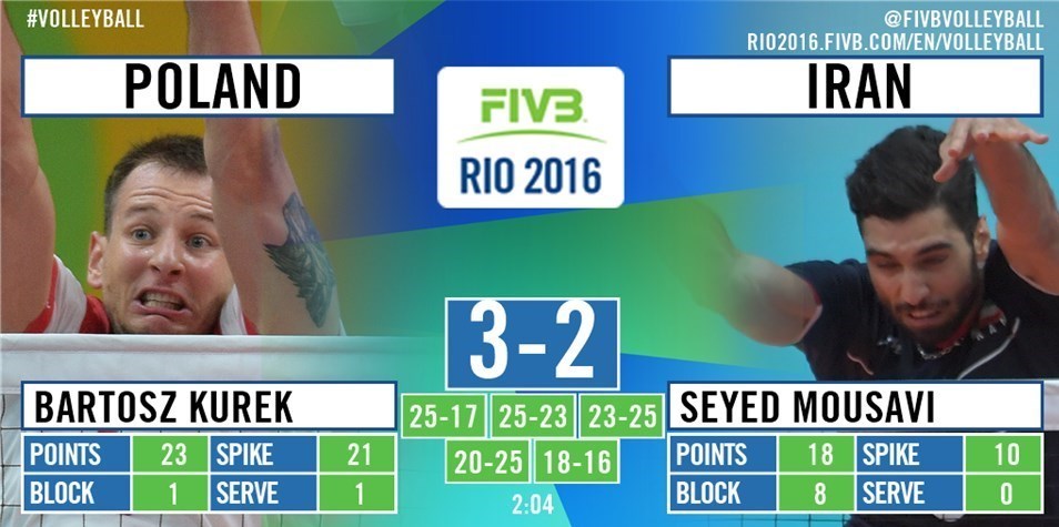 به گزارش خبرگزاری تسنیم، تیم ملی والیبال ایران در بازی دوم خود در المپیک با نتیجه 3 بر 2 مغلوب لهستان شد. محمد موسوی، مدافع وسط تیم ایران در این بازی 18 امتیاز (10 اسپک و 8 دفاع) برای تیم کشورمان کسب کرد. برای لهستان هم بارتوژ کورک 23 امتیاز بهدست آورد.