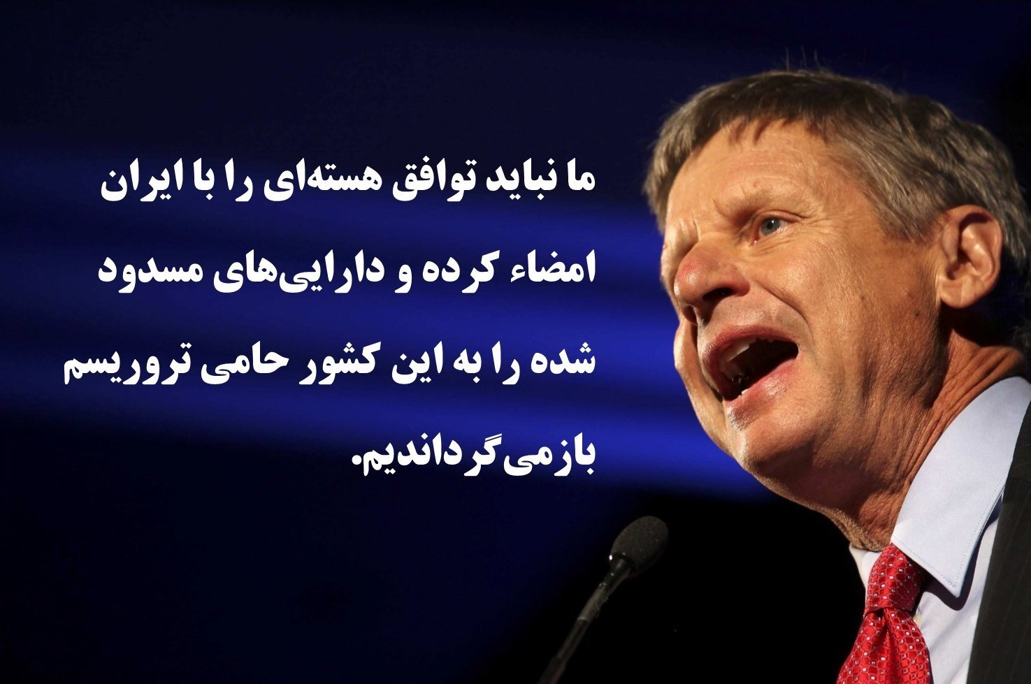 وی مدعی شد: «ایران ثابت کرده که از تروریسم حمایت مالی میکند. این کشور حامی مالی شماره یک تروریسم در دنیا است». وی نتیجه میگیرد: آزادی مبلغ «165 میلیارد دلار» از داراییهای ایران اشتباه بود زیرا «مقداری از این پول صرف تروریسم خواهد شد. نه، ما نباید این توافق را امضاء میکردیم. ما نباید داراییها را رفع توقیف میکردیم.».