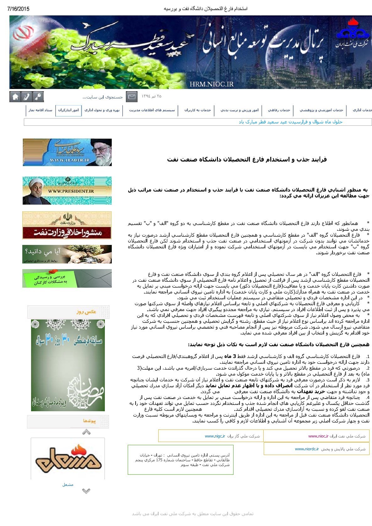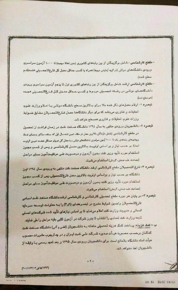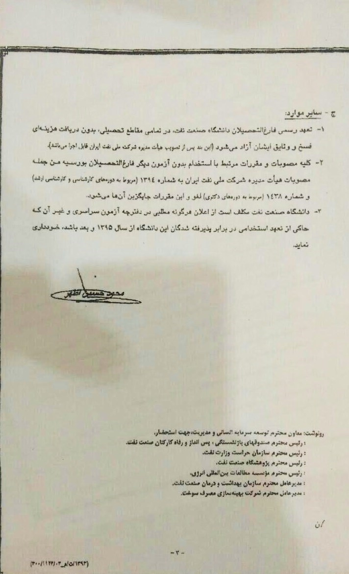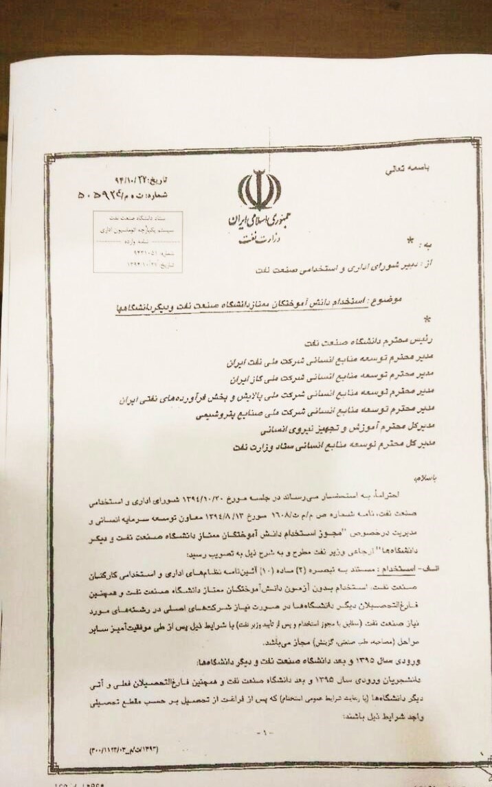 علاوه بر این در پرتال مدیریت توسعه منابع انسانی شرکت ملی نفت، فرآیند جذب و استخدام فارغالتحصیلان دانشگاه صنعت نفت (پیوست شماره 2) بهصورت واضح به جذب بدون آزمون گروه الف و کارشناسی ارشد و دکتری اشاره شده است. متأسفانه بعد از ابلاغیه 19 خرداد سال 1394 وزارت نفت (پیوست شماره 3) این روند جذب و کاریابی بعد از گذشت سالیان متوالی بهیکباره متوقف گردید. بعد از پیگیریهای متعدد فارغالتحصیلان و دانشجویان از طریق نامهنگاری با شخص وزیر نفت و همچنین مسئولان دانشگاه صنعت نفت، خبری در سایت رسمی دانشگاه (پیوست شماره 4) در خصوص بازگشت روال جذب فارغ التحصیلان گروه الف منتشر شد ولی بعد از پیگیریهای مستمر فارغالتحصیلان از مسئولین وزارت نفت آغاز هرگونه جذب را منوط به ابلاغیه جدید کردند. بعد از 3 ماه پیگیری و دو تجمع توسط فارغالتحصیلان در 5 و 6 دی ماه 1394 و یک هفته تحصن غذا و لغو امتحانات دانشجویان در سه دانشکده آبادان، اهواز و تهران، ابلاغیه مذکور (پیوست شماره 5) صادر گردید.