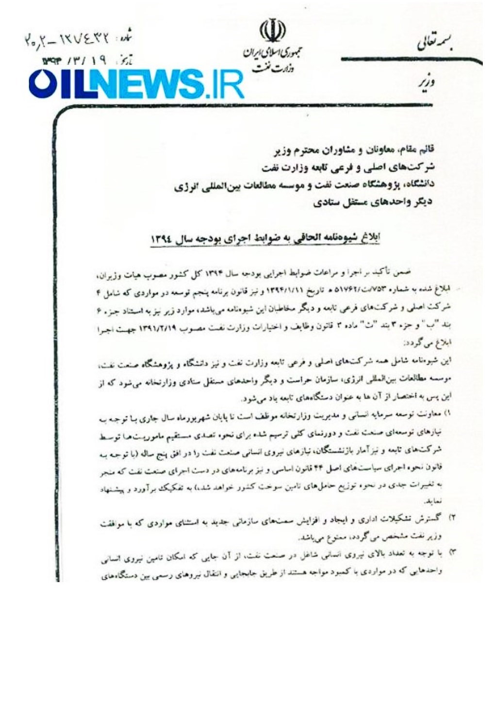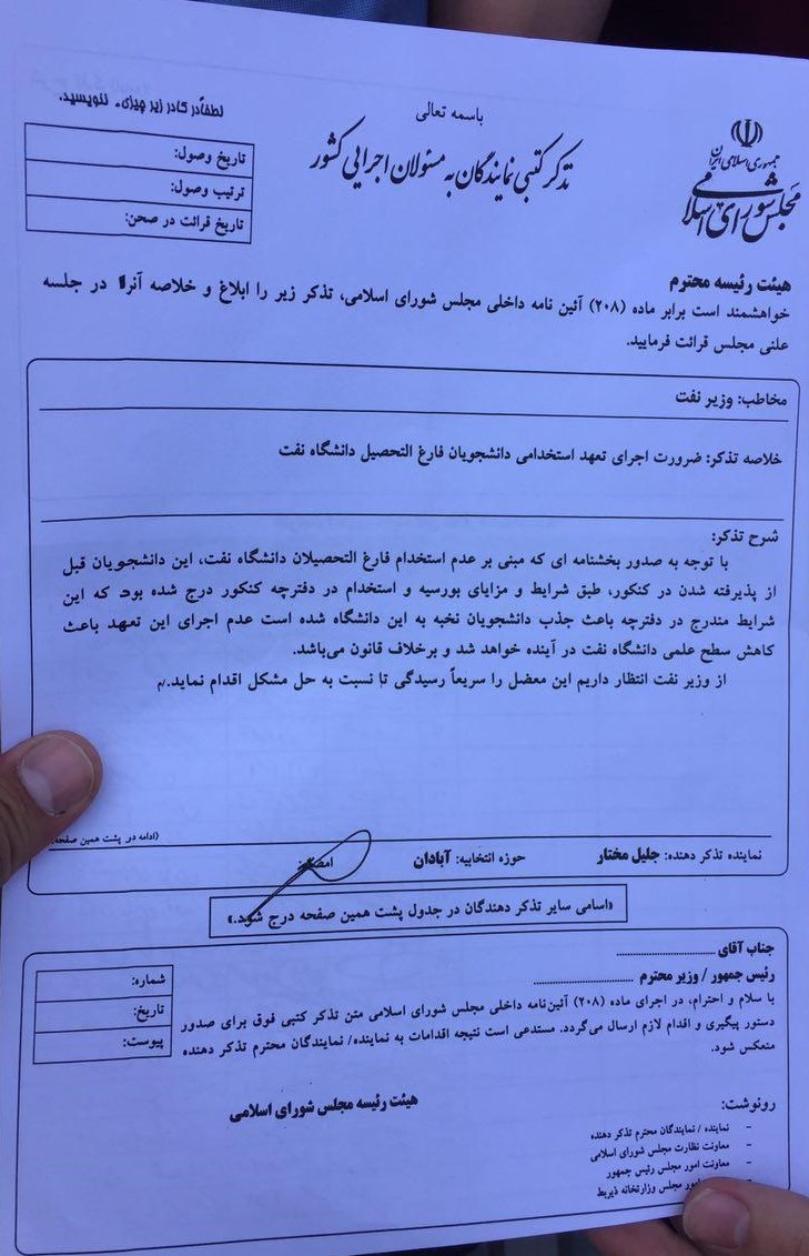 (پیوست 7) تذکر 19 نماینده مجلس به وزیر نفت برای پیگیری مشکل دانشجویان صنعت نفت