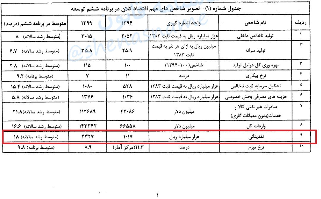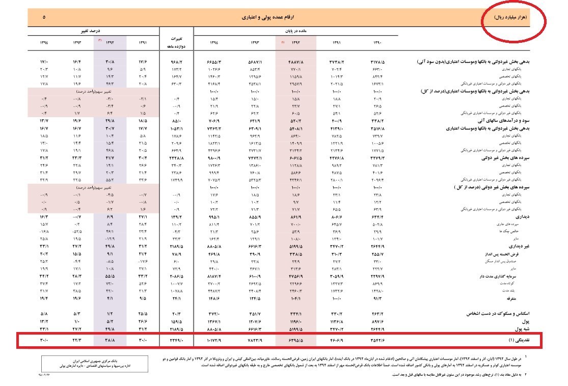 جدول نقدینگی براساس آمار بانک مرکزی که نقدینگی موجود در اسفند 94 را 10173هزار میلیارد ریال میداند؛ یعنی 10 برابر جدول اصلاحیه برنامه توسعه!