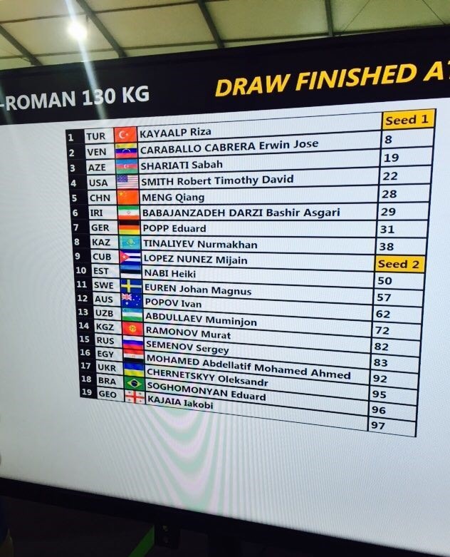 باباجانزاده در دور اول استراحت خواهد داشت و در دور دوم با منگ از چین روبهرو میشود. کشتیگیر سنگینوزن کشورمان در صورت برتری با تنالیف قزاق یا پوپ آلمانی مبارزه خواهد کرد. صباح شریعتی، کشتیگیر ایرانی آذربایجان و رضا کایالپ ترک در گروه بشیر هستند.