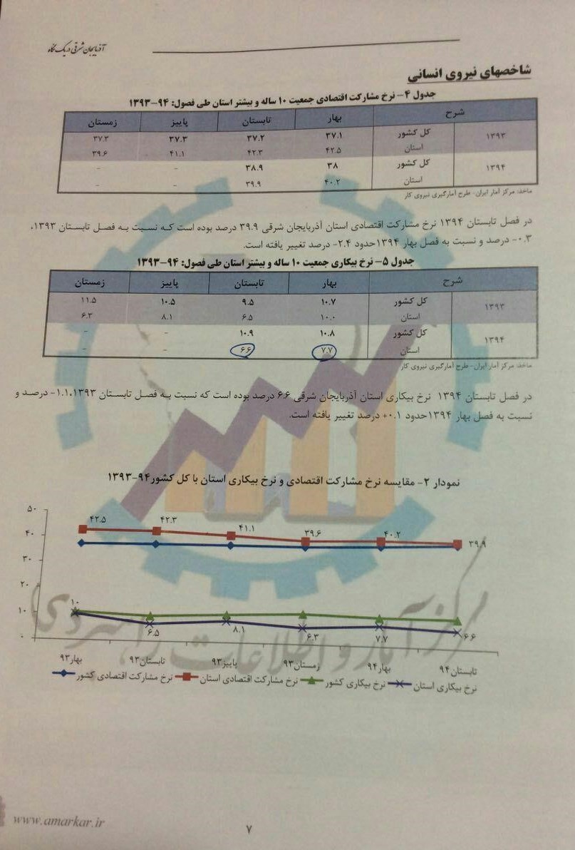 با وجود همه این فعالیتهای عمرانی، نرخ بیکاری ما در استان، 11 درصد بود ولی با کمال تعجب، مدتی قبل در حضور وزیر کار وقتی صحبت از کم بودن سرمایه گذاری شستا در آذربایجان شرقی و درخواست برای سرمایه گذاری شستا در استان شد، پس از این سخنان، وزیر آماری را نشان داد که آمار بیکاری شما در تابستان 94، 6.6 درصد است و اولویت ما استانهایی است که بیکار زیادی دارند و بنابراین ما نمیتوانیم در آذربایجان شرقی سرمایه گذاری کنیم!