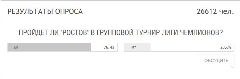 در حدود 77 درصد هوداران فوتبال روسیه در نظرسنجی اسپرت اکسپرس به گزینه صعود تیم روستوف با حذف تیم آژاکس آمستردام و حضور در دور گروهی لیگ قهرمانان اروپا رای مثبت دادهاند. بیش از 23 درصد شرکت کنندگان نیز عدم صعود روستوف را پیشبینی کردهاند.