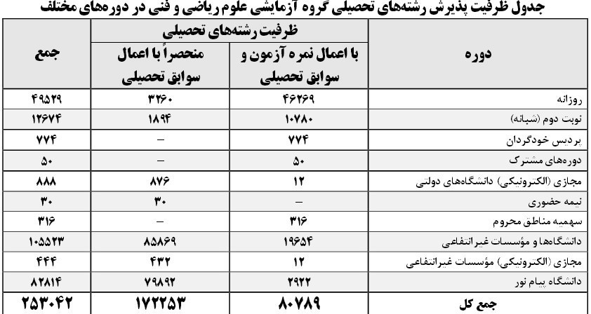 به عبارتی دیگر از مجموع 253 هزار و 42 ظرفیت در گروه ریاضی،49 هزار و 845 نفر در دورههای روزانه پذیرش میشوند و سهم پذیرش در سایر دانشگاههای پولی 203 هزار و 197 نفر است.