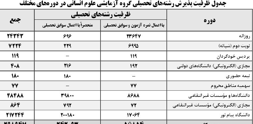از 298 هزار و 947 ظرفیت موجود در گروه علوم انسانی، سهم دورههای روزانه 24 هزار و 420 نفر است و سهم پذیرش در دانشگاههای پولی274 هزار و 527 نفر است.