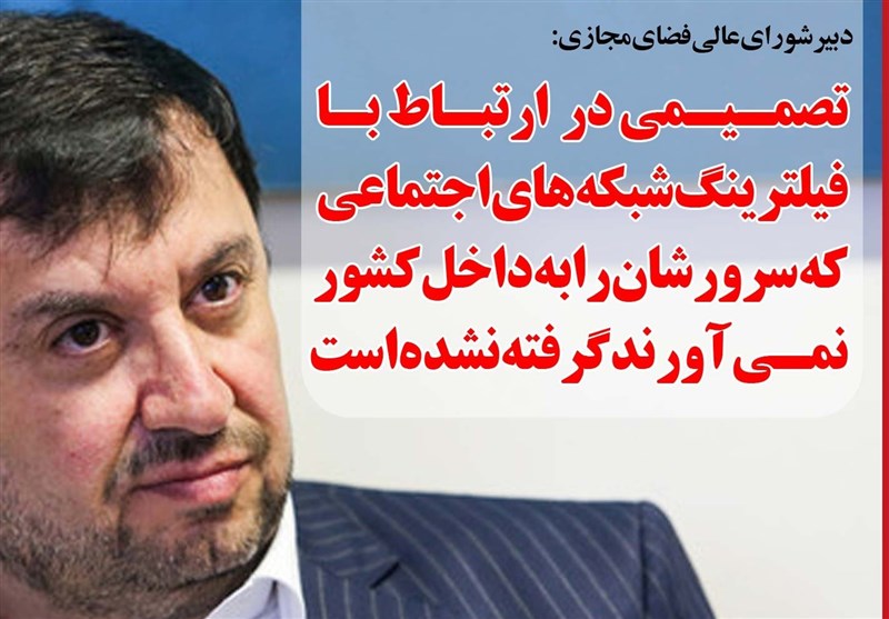 دبیر شورای عالی فضای مجازی با بیان اینکه تصمیمی در ارتباط با فیلترینگ شبکه‌های اجتماعی که سرورشان را به داخل کشور نمی‌آورند گرفته نشده است، گفت: شرکت‌هایی که تمایل به این کار دارند، قاعدتا باید با بخش خصوصی وارد مذاکره شوند.