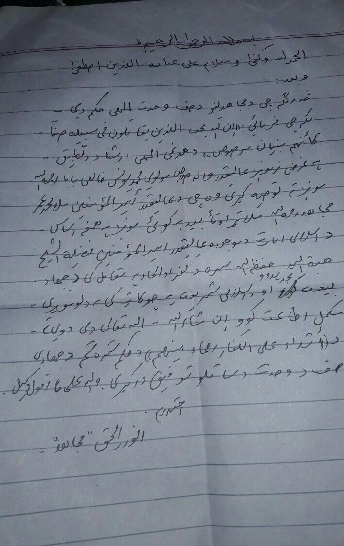 انوارالحق مجاهد در پیام بیعت خود گفته که بر اساس توصیه پدرم، با ملا هیبتالله بیعت میکنم و از وی در جنگ با دشمنان پیروی میکنم.