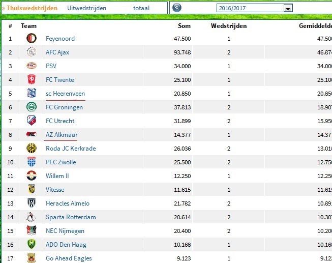 تیمهای آژاکس آمستردام و پی اس وی آیندهوون نیز بهترتیب با برخورداری از حمایت 46.874 و 34 هزار نفر در ورزشگاه هنگام برگزاری دیدارهای خانگیشان در ردههای دوم و سوم ردهبندی پرتماشاگرترین تیمهای اردیویژه هلند ایستادهاند.