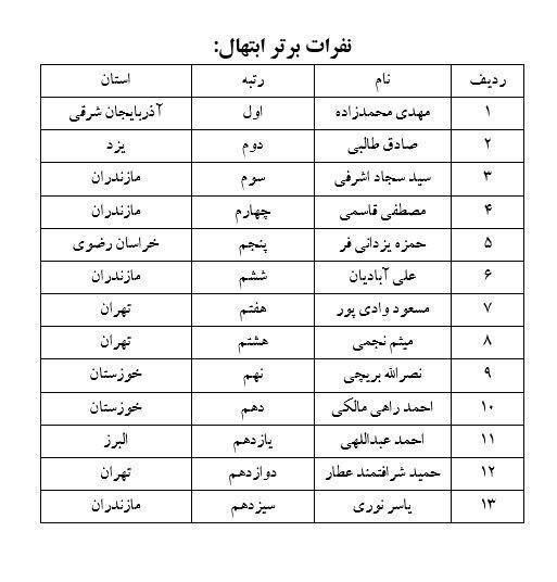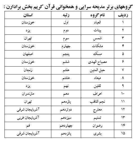 به گزارش خبرنگار فرهنگی باشگاه خبرنگاران تسنیم «پویا» نتایج مرحله مقدماتی مسابقات ابتهال، تواشیح و همخوانی قرآن کریم کشور مشخص شد که در ادامه میتوانید آن را مشاهده کنید. این افراد و گروهها در فینال این مسابقات که مهرماه سال جاری همزمان با مسابقات سراسری قرآن کریم در استان گیلان برگزار خواهد شد به رقابت نهایی با یکدیگر خواهند پرداخت.