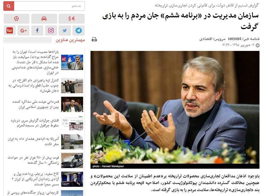 به گزارش خبرنگار اقتصادی خبرگزاری تسنیم، امروز (سهشنبه) خبری مبنی بر تأکید دوباره سازمان مدیریت و برنامهریزی بر «تولید تجاری» محصولات دستکاری شده ژنتیک (تراریخته) در خبرگزاری تسنیم منتشر شد. {اینجا}