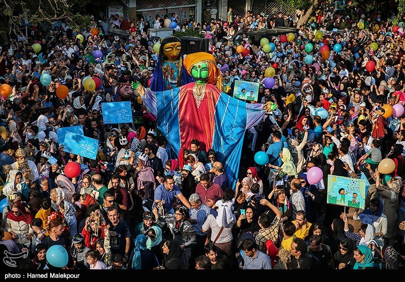 عقربههای ساعت از پنج میگذشت. قرار بر پنج بود و پیش از پنج، هزارهای از جمعیتها در میانه تالار وحدت و حافظ ایستاده بودند. پرچمها آبی رنگ مواج شدند و میگفتند «آسمان عروسکها آبی است». شروع با نوای سازهای کوبهای و بادی بود. موسیقی متن خانه مادربرزگ طنینانداز میشود. همگان زمزمه میکنند اشعارش را. صدایی واحد شنیده میشد. شادی جمعیت را غرق کرده بود. عروسکها غولپیکر از دو سوی خیابان شهریار وارد شدند. هیجان کودکان تحریک شد. از دو عروسک هندی تا ترانسفورمر زرد رنگ.