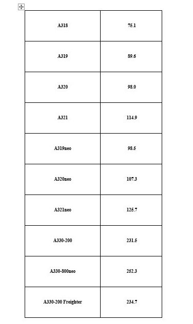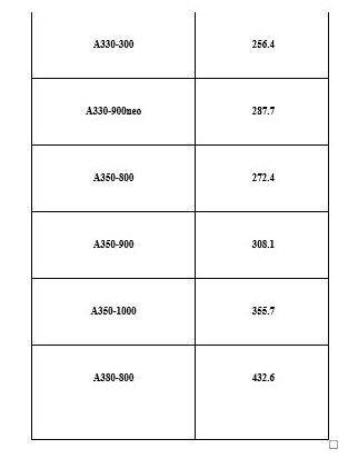 فهرست هواپیماهای ایرباس و قیمت آن ها به میلیون دلار به شرح زیر است: