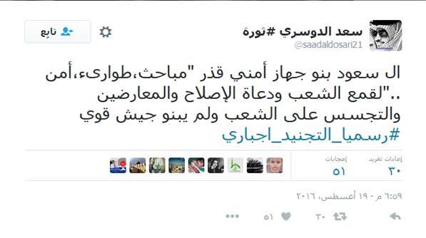 در پی خسارتهای سنگین عربستان در حمله به یمن و فرار سربازان و مزدوران سعودی از آتش ارتش و کمیتههای مردمی، تعدادی از کاربران سعودی با انتشار مطالب و عکسهای متعدد در توئیتر فراخوان مفتی عربستان برای سربازی اجباری جوانان به منظور شرکت در حمله به کشور برادر، یمن را به تسمخر گرفتند.