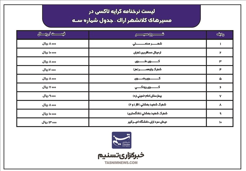 شهردار کلانشهر اراک اضافه کرد: نرخ‌های مصوب جدید از آغاز ماه شهریور جهت اجرا به رانندگان تاکسی در شهر اراک ابلاغ و اعلام شده است.