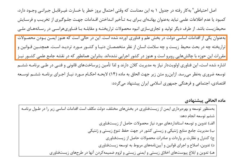 پروتکل ایمنی زیستی «کارتاهنا» در سال 1382 در مجلس شورای اسلامی تصویب شد؛ مطابق این پروتکل لازم بود سازوکارهایی برای به حداقل رساندن مخاطرات تراریختهها تعبیه شود. متعاقب آن قانون ایمنی زیستی کشور در سال 88 تصویب شد و 4 سال بعد آییننامه اجرایی موضوع بند (ج) ماده 3 درخصوص شرح وظایف وزارتخانههای ذیربط ابلاغ شد. در آییننامه مذکور کلیه ارزیابیها و مخاطرات محصولات تراریخته لحاظ شده است. اجرای این آییننامه میتوانست از حقوق مردم در رابطه با ریسک سلامت محصولات تراریخته دفاع کند، اما بلافاصله پس از ابلاغ رسمی، تاجران ذینفوذ تراریخته آن را «بازدارنده» قلمداد کردند. این افراد با طرح این کلیدواژه سعی کردند دولت را مخالف پیشرفت فناوری معرفی نمایند. مهرماه 94 معاون رئیس جمهور و رئیس شورای عالی ایمنی زیستی ــ دکتر جهانگیری ــ آییننامه اجرایی بند (ب) ماده 7 قانون ایمنی زیستی درخصوص برچسبگذاری و حمل و نقل فرامرزی و ترانزیت محصولات تراریخته را ابلاغ کرد.