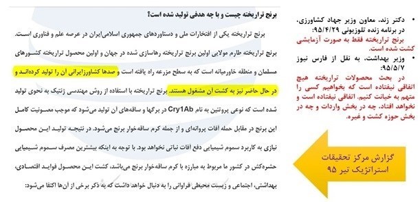 محمدعلی ملبوبی، معاون پژوهشگاه ملی مهندسی ژنتیک و زیستفناوری، که سمت پرزیدنت فدراسیون بیوتکنولوژی آسیا و ریاست کارگروه کشاورزی ستاد توسعه زیستفناوری را نیز بهعهده دارد، خود یکی از اصلیترین طرفداران تجاریسازی این محصولات است. فیلم 30 ثانیهای اظهارات او را ببینید.