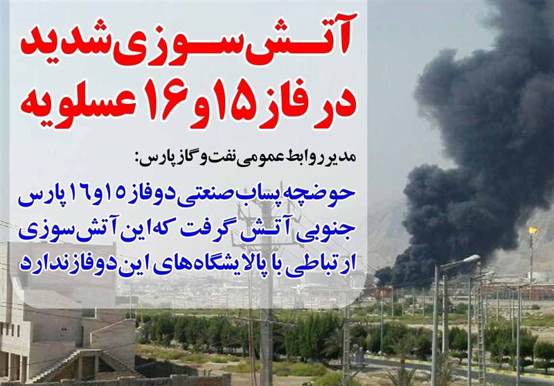 مدیر روابط عمومی شرکت نفت و گاز پارس گفت: حوضچه پساب صنعتی دو فاز 15 و 16 پارس جنوبی آتش گرفت که این آتش سوزی ارتباطی با پالایشگاه‌های این دو فاز ندارد.