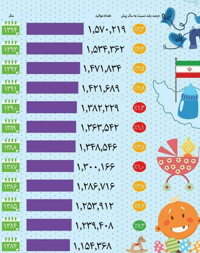 براساس اطلاعات ثبت احوال کشور نرخ رشد موالید سال 91 نسبت به سال 90 معادل 2.8 درصد افزایش داشته این رقم سال 92 نسبت به 91 حدود 3.5 درصد، سال 93 نسبت به 92 حدود 4.2 درصد و در سال 94 این نرخ به 2.3 درصد رسیده است یعنی به شدت شیب آن کاهش یافته است. کاهشی که به گفته کارشناسان از قبل قابل پیشبینی بوده است.