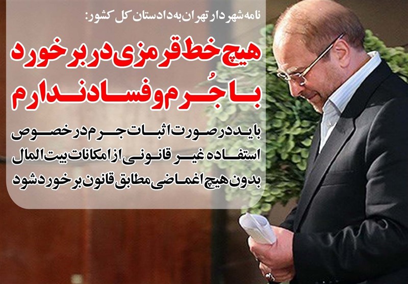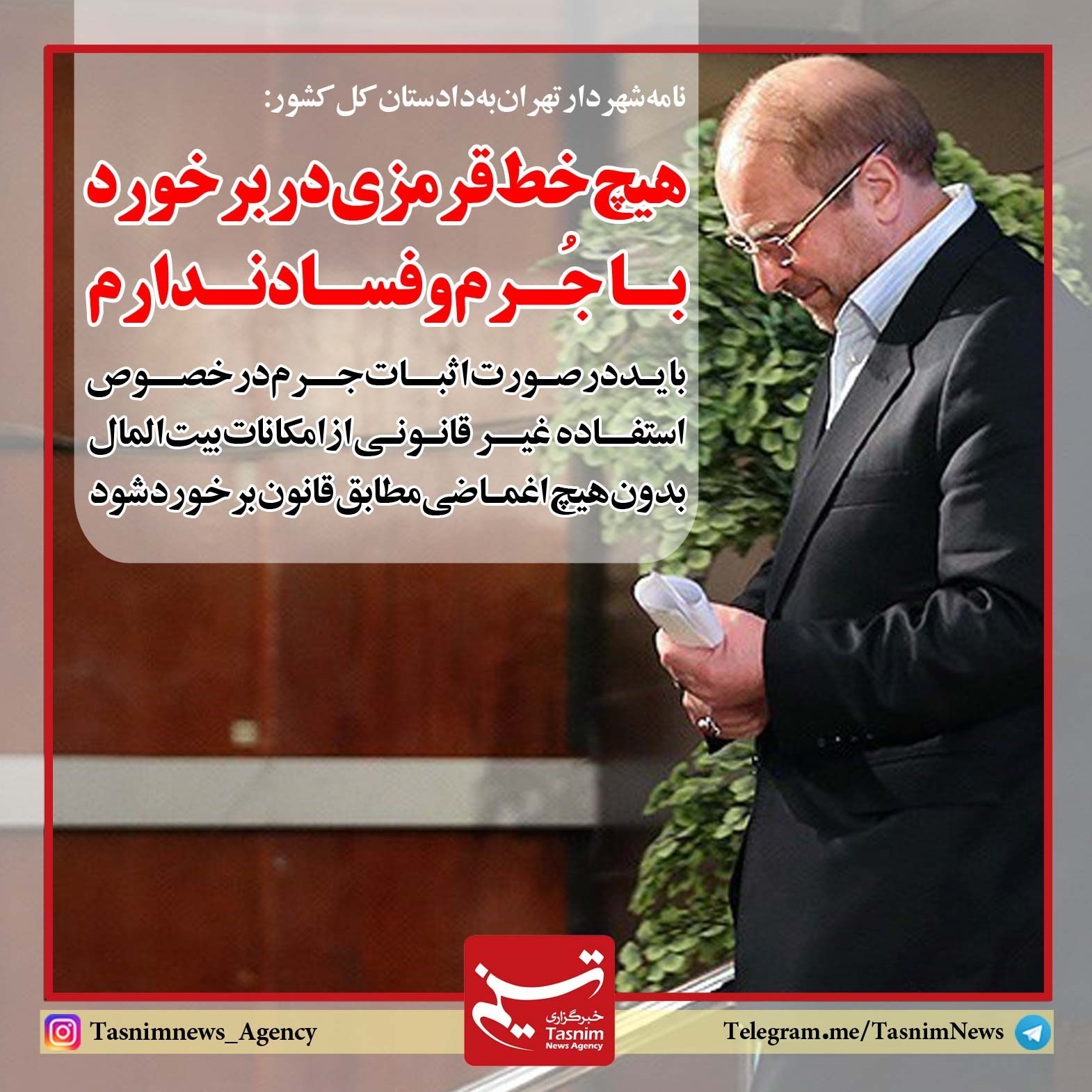 شهردار تهران طی نامه‌ای به دادستان کل کشور با بیان اینکه هیچ خط قرمزی در برخورد با جرم و فساد ندارم، گفت: باید در صورت اثبات جرم درخصوص استفاده غیرقانونی از امکانات بیت‌المال بدون هیچ اغماضی مطابق قانون برخورد شود.