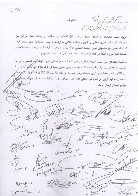 ما امضا کنندگان ذیل، ضمن احترام به قانون و این نکته که به هر تخلفی فارغ از اینکه چه شخصی و در چه لباسی و از چه لیستی آن را مرتکب شده باشد باید در مراجع قضایی رسیدگی کرد، متذکر میشویم که امروز با نشر اکاذیب ضمن خدشه دار کردن حیثیت فردی اعضا به این نهاد نظارتی و قانونگذاری خدشه وارد شده است. لذا ضمن محکوم کردن این اقدام غیراخلاقی علیه اعضای شورای شهر سپاسگذار است مراتب جهت رسیدگی به مراجع ذی صلاح ارسال گردد.
