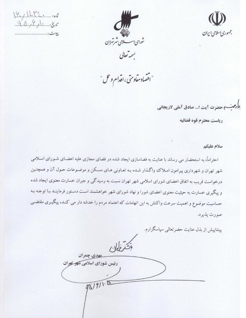 احتراماً به استحضار میرساند با عنایت به فضاسازی ایجاد شده در فضای مجازی علیه اعضای شورای اسلامی شهر تهران و شهرداری پیرامون املاک واگذار شده به تعاونیهای مسکن و موضوعات حول آن و همچنین درخواست قریب به اتفاق اعضای شورای شهر نسبت به رسیدگی و جبران خسارت معنوی ایجاد شده و پیگیری خسارت به حیثیت معنوی اعضای شورا و نهاد شورای شهر خواهشمند است دستور فرمایید با توجه به حساسیت موضوع و اهمیت سرعت واکنش به این اتهامات که اعتماد مردم را خدشه دار میکند پیگیری مقتضی صورت پذیرد.