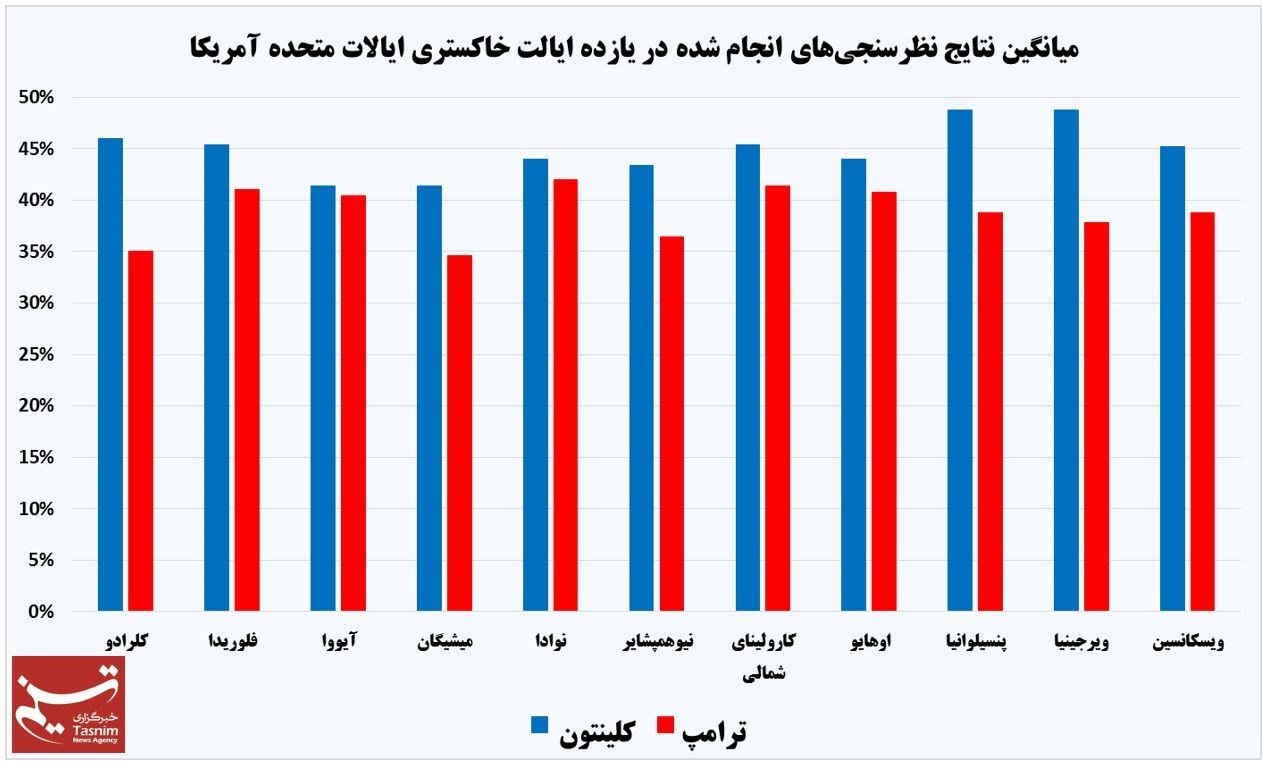 بررسی نتایج نظرسنجیهای انجام شده طی ماههای اخیر در این یازده ایالت نیز گویای پیشتازی کلینتون بر ترامپ و افزایش فاصله این دو رقیب است. در واقع در تمامی این یازده ایالت، کلینتون توانسته است اقبال عمومی بیشتری را به خود جلب کند.