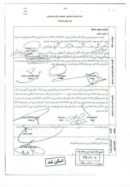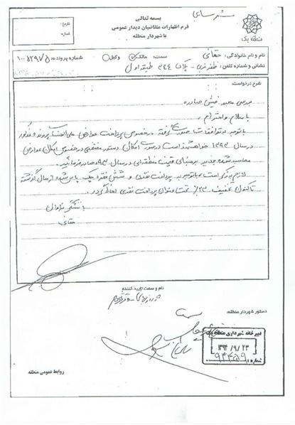 او در نامه ای به تاریخ خطاب به شهرداری درخواست کرده است که عوارض ساختمان خود را به حساب سال 93 پرداخت کند که در نتیجه این موضوع و با فشاری وارد کرده نه تنها پرداختی به شهرداری تهران در ازای عوارض آن سال نداشته بلکه سه میلیارد ریال هم از خزانه شهرداری باز پس می گیرد، اتفاقی که معمولا رخ نمی دهد.
