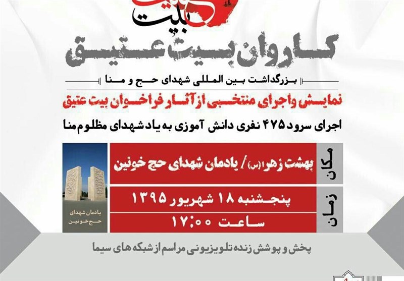 کاروان بیت عتیق که همایش فرهنگی و هنری برای گرامیداشت شهدای فاجعه منا برگزار کرده مراسم اختتامیه را همزمان با سالروز فاجعه من در تاریخ یکم مهر ماه در تالار اندیشه حوزه هنری تدارک دیده است.