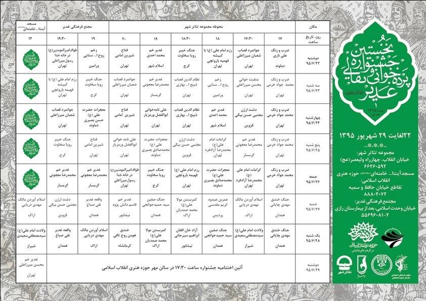 این جشنواره به همت مرکز هنرهای نمایشی حوزه هنری و حمایت موسسه فرهنگی تسنیم نور، همزمان با هفته امامت و ولایت (از عید سعید قربان تا عید غدیر خم) برگزار میشود و عموم مردم میتوانند به تماشای این آثار در مکانهای یاد شده و طبق جدول بهرهمند شوند.