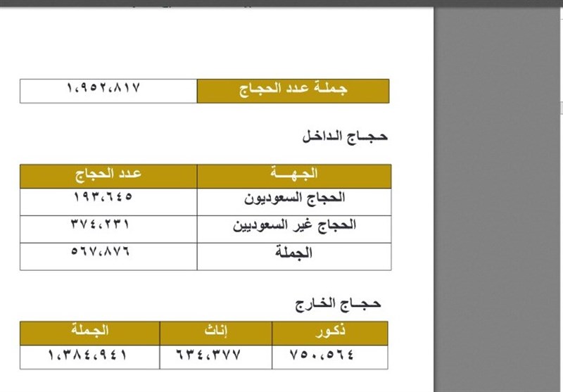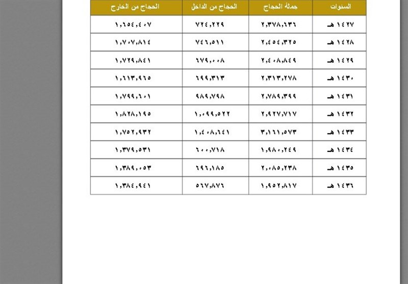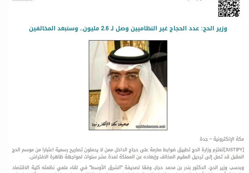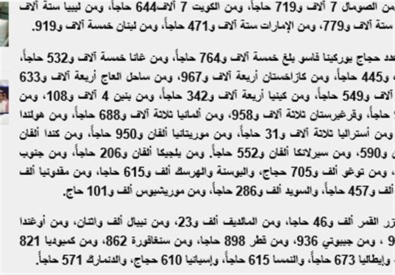 نکته مهم: آمار فوق آمار رسمی اعلامشده از سوی حکومت سعودی است که بهوضوح تبعیض در زمینه حج و صدور چند برابری روادید حج و نیز ضعف و کوتاهی دستگاههای مسئول در جلوگیری از مشارکت افراد فاقد مجوز حج در موسم حج را نشان میدهد که این تعداد بهاعتراف حکومت سعودی از 500 تا یک میلیون و 400 هزار نفر میرسد، نکته مهم این است که این آمار غیر از آمار حجاج غیرقانونی یا فاقد مجوز داخل عربستان است که تعداد آنها در برخی موسمها به بیش از دو میلیون نفر هم رسیده است که بندر بن حجاز وزیر حج سابق در یکی از موسمهای حج به آن اعتراف کرده بود (تصویر زیر) جمعیت عربستان بر اساس آمار سال 2014 میلادی، 31,521,418 نفر است که بر اساس مصوبه سازمان همکاری اسلامی، سهمیه قانونی و مجاز این کشور باید حداکثر 32 هزار نفر باشد نه 700 هزار یا یک میلیون و 400 هزار نفر بهروایت رسمی و بیشتر از این رقم بهصورت غیرقانونی.