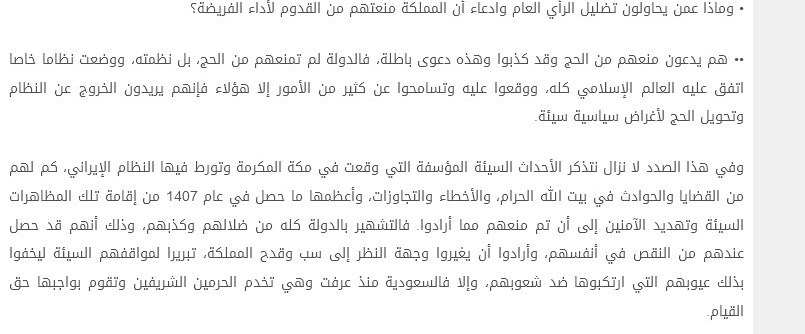 آنها مدعی شده بودند که «پادشاهی عربستان با تلاشهای ایران برای سیاسی کردن فریضه حج مخالف است، ایران در برابر حضور حجاج خود در مراسم حج مانعتراشی میکند و قصد دارد با سوءاستفاده از حج به حکومت عربستان خدشه وارد کند،در حالی که سعودی همه امکانات مادی و انسانی خود را برای خدمترسانی به ضیوف الرحمن و فراهم کردن امنیت و راحتی آنها از لحظه ورود تا خروج به کار گرفته است».