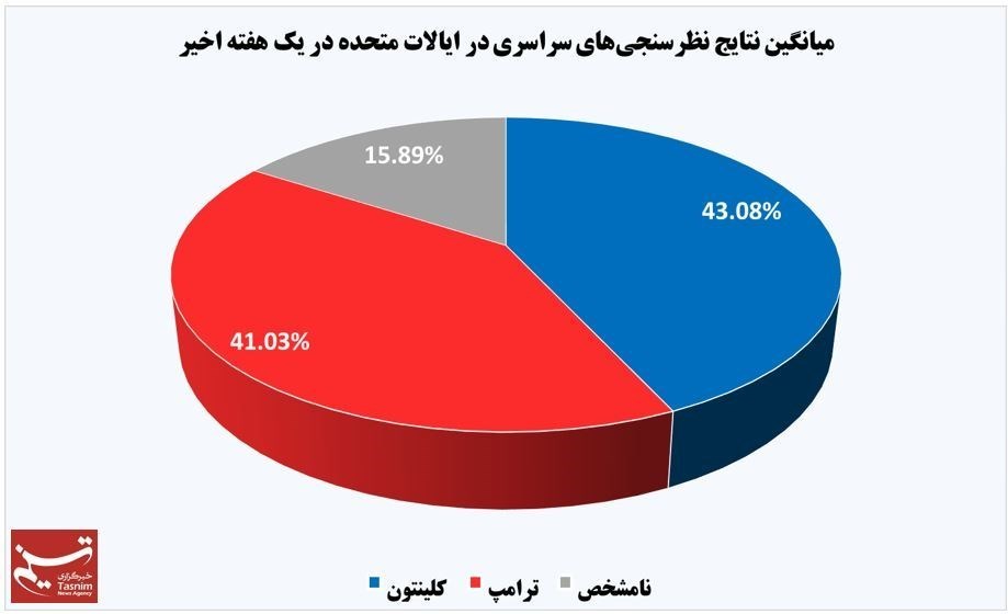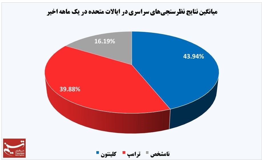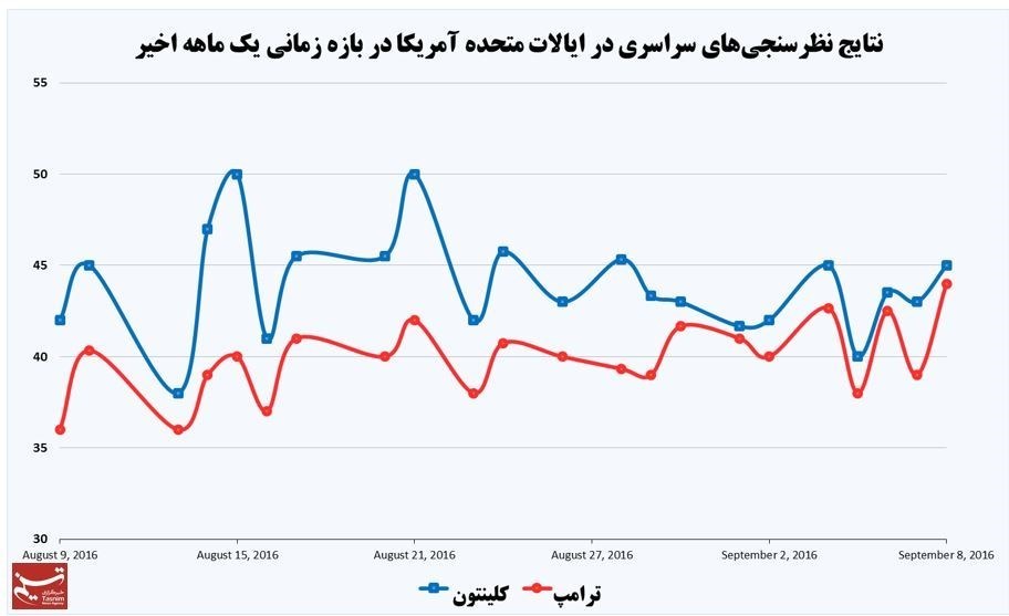 نتایج نظرسنجی مؤسسه راسموسن هم که طی روزهای 6و 7 سپتامبر (16و 17 شهریور) انجام شده است، نشان میدهد که کلینتون با جلب 43 درصد اقبال عمومی از ترامپ (39 درصد) پیش است.