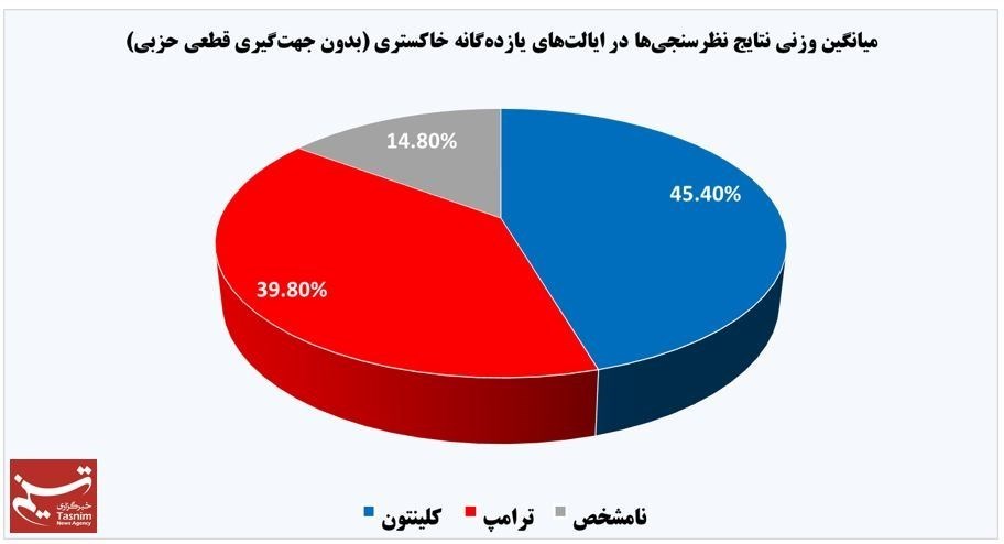در مجموع نیز با احتساب «میانگین وزنی» ــ که از ترکیب اقبال عمومی در تمامی این ایالتها به هر یک از دو نامزد و تعداد آرای الکترال هر ایالت حاصل شده است ــ هیلاری کلینتون 5.6 درصد جلوتر از ترامپ است، این در حالی است که اختلاف این دو براساس همین شاخص در هفته پیش برابر با 6.2 درصد بود.